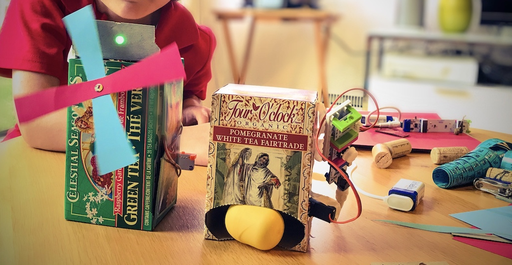 Mon fils de 8 ans et moi avions rapidement fabriqué des prototypes à la maison. Nous les avions créé avec des littleBits et des boîtes à thé vides. C’est mon fils qui avait eu l’idée que les élèves auraient le choix de construire une distributrice ou un moulin à vent. Des projets simples à faire. Des projets qui permettaient aux enfants de s’initier à l’électronique ainsi que de savoir quand utiliser un servomoteur et quand utiliser un moteur à courant continu.